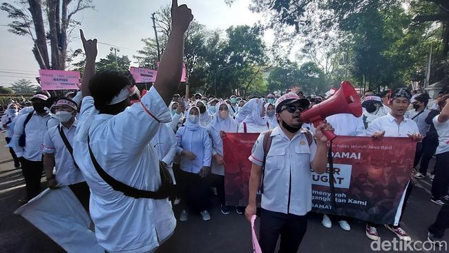 Para nakes ini berasal dari berbagai daerah di Jawa Barat. Hingga Pukul 08.30 WIB, ribuan nakes terus berdatangan dengan membawa spanduk dan poster tuntutan.