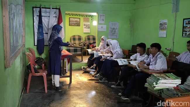 Pantauan detikJabar, Jumat (5/8/2022), para siswa SMP PGRI melakukan kegiatan belajar mengajar (KBM) dengan meminjam dua ruangan bekas perpustakaan SDN 205 Neglasari, Kota Bandung.