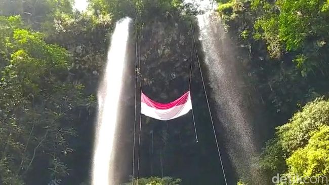 Berbagai cara dilakukan untuk memperingati HUT ke-77 RI. Salah satunya seperti yang dilakukan Tagana Kabupaten Tasikmalaya yang mengibarkan bendera merah putih raksasa di Curug Dua Cipadaresi Parentas Cigalontang, Rabu (17/8/2022) sore. Bendera raksasa itu dibentangkan di tengah air terjun yang indah setinggi 50 meter.