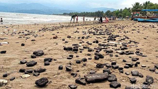 Pantauan detikJabar, sejak Sabtu (20/8) hingga Minggu (21/8) batu-batu hitam pekat itu masih terlihat berserakan di sepanjang pesisir pantai dan jadi mainan anak-anak. Selain membuat pemandangan tak sedap, kondisi batuan hitam diduga batubara itu membuat kesan kumuh di area itu.