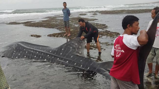 Seekor Hiu Tutul 'naga bintang' (Rhicodon typus) terdampar di pantai Pangandaran blok pasir putih. Kemunculan, spesies ikan terbesar di dunia ini membuat heboh warga.