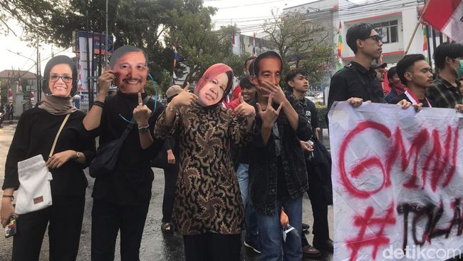 Pantauan detikJabar di lokasi, aksi demo itu sudah berlangsung sekitar satu jam setengah. Mereka membawa berbagai macam atribut seperti spanduk, keranda dan topeng empat pejabat negara.