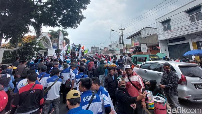 Buruh peserta aksi unjuk rasa tumplek di jalan raya. Di depan mereka juga terparkir mobil komando. Alhasil lalulintas tersendat buntut aksi tersebut hingga pihak kepolisian memberlakukan rekayasa lalulintas.