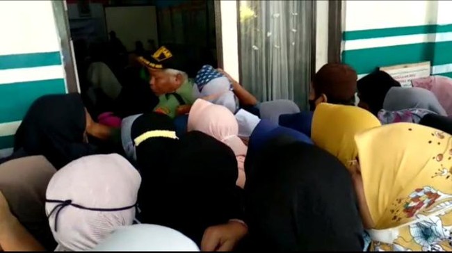 Tak berselang lama, warga yang sebagian besar ibu-ibu itu mendorong pintu hingga berdesakan. Dari arah berlawanan, satpam desa sempat menghadang ibu-ibu agar tidak berebut masuk.