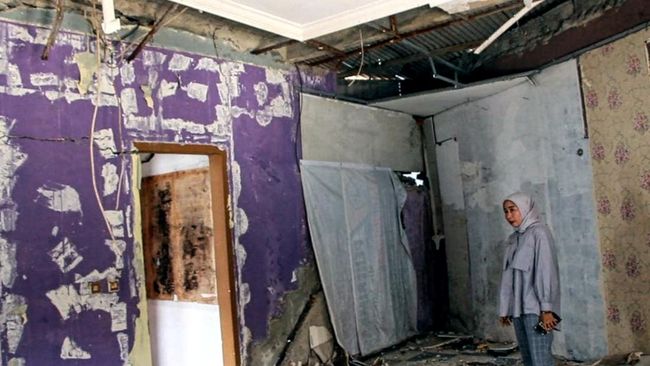 "Kemarin ada roboh lagi karena hujan lebat dua hari yang lalu. Untung karena selama ini kan mengungsi di rumah orang tua karena kondisi rumah di sini ambruk. Ini roboh, plafon sudah turun lalu kemudian kamar mandi ambruk, kamar mandi plafon kamar juga temboknya ambruk kamar belakang," ujar Siti.