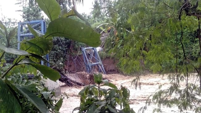 "Kejadiannya saat hujan deras, awalnya air sungai terus meluap. Jembatan goyang, lalu satu persatu kawat sling lepas. Lalu tiang besi di ujung jembatan mulai tertarik dan tanah penahannya ambrol," kata Rudi, warga di sekitar lokasi kepada detikJabar.