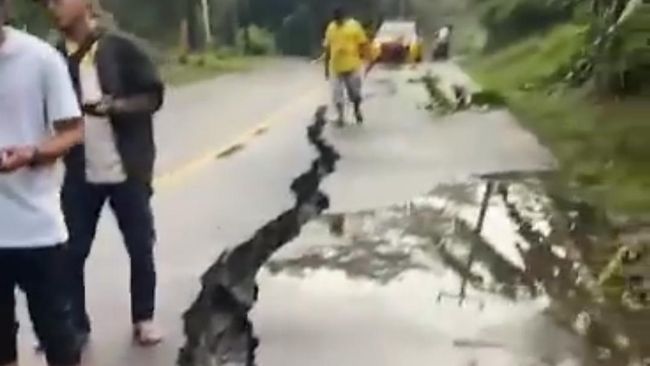 "Itu kejadiannya tadi malam, nggak tahu karena hujan atau apa. Atau bisa juga karena pergeseran tanah, jadi retak jalannya kurang lebih 100 meter," kata Roni.