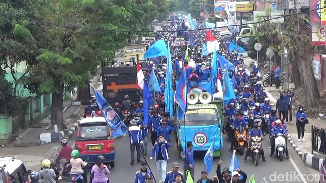 Pantauan detikJabar, ribuan buruh itu ada yang jalan kaki, ada yang menaiki motor ada juga yang menggunakan mobil, tiga mobil komando terus mengiringi langkah kaki buruh.