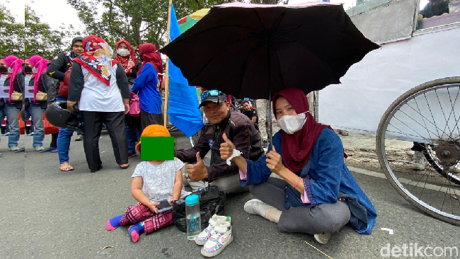 Di tengah keriuhan massa aksi yang menyuarakan aspirasinya, tepat di belakang barisan massa aksi ada seorang buruh perempuan bernama Santi (40) duduk bersama anaknya S (2) yang turut ikut aksi untuk mencari keadilan.