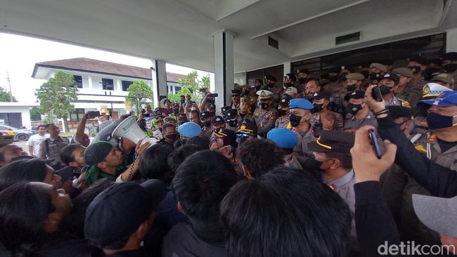 Pantauan detikJabar, Kamis (29/9/2022), puluhan mahasiswa mencoba merangsek masuk ke dalam kantor DPRD. Sejumlah petugas langsung menghadang.