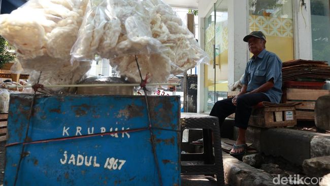 Dengan memikul kaleng kerupuk berukuran besar, Aki pun menjajakan kerupuk jadulnya kepada pembeli di sepanjang jalan hingga pelataran pasar.