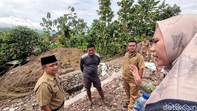 Camat Kecamatan Palabuhanratu, Kabupaten Sukabumi Ali Iskandar meninjau lokasi tembok jebol di area Perumahan Pesona Farida Regency. Di tengah kegiatan seorang perempuan berhijab tiba-tiba menghampiri Camat Ali dan mengadukan soal ganti rugi rumahnya yang terdampak jebolnya tembok penahan tanah dari area perumahan.