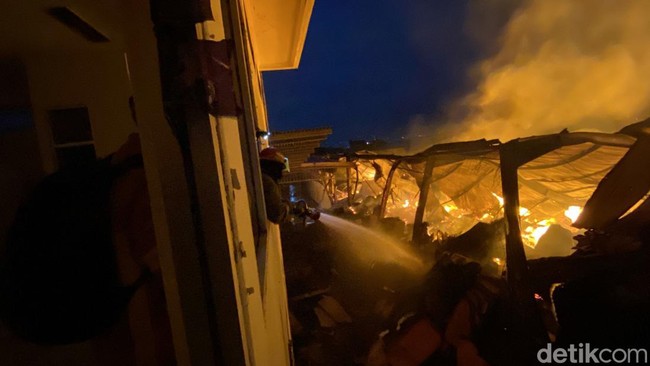 Pantauan detikJabar, Selasa (25/10/2022) sekitar pukul 20.35 WIB, api yang membakar bangunan gudang tripleks ini belum padam. Karena tembok bangunan gudang ini sudah roboh, api terlihat merembet membakar seluruh tripleks yang tersimpan rapi di gudang tersebut.