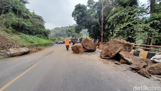 Dari pantauan detikjabar di lokasi, tim gabungan dari TNI/Polri, BPBD dan pihak lainnya telah tampak berada di lokasi. Longsor yang terjadi menggelindingkan beberapa bongkahan batu besar berbagai ukuran yang diantaranya sebesar kendaraan minibus. Bongkahan-bongkahan batu tersebut sebagiannya kini masih memakan seperempat badan jalan.