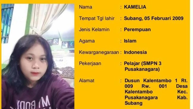 Dilihat detikJabar dari surat kabar yang beredar di media sosial, remaja wanita tersebut bernama Kamelia (13) yang merupakan salah satu pelajar SMPN 3 Pusakanagara.