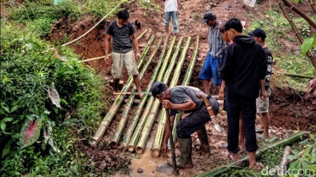 "Warga dibantu aparat desa bergotong royong membuat jembatan sementara yang terbuat dari bambu untuk akses jalan warga sekitar dikarenakan retakan tanah yang melebar dengan ukuran 1,5 M," tulis Raphael.