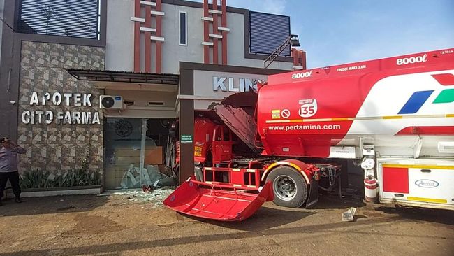 Bagian kabin depan truk tangki Pertamina bernopol Z 9106 MO itu nyaris masuk ke bagian lobi klinik. Beruntung tidak ada korban jiwa dalam peristiwa tersebut.