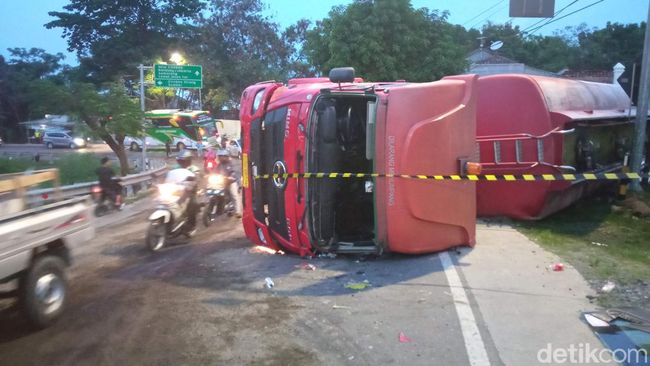 Sebuah truk tangki bermuatan Bahan Bakar Minyak (BBM) terguling di jalan Jenderal Sudirman, Desa Ciperna, Kecamatan Talun, Kabupaten Cirebon. Akibat dari kejadian itu, BBM yang dibawa truk tersebut tumpah ke jalanan.