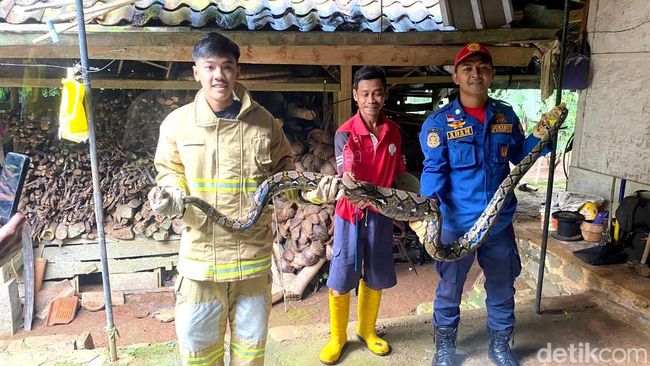 Warga Dusun Cikananga, Desa Selamanik, Kecamatan Cipaku, Kabupaten Ciamis, Jawa Barat, digegerkan dengan penemuan ular sanca kembang bersembunyi di dalam kandang ayam warga, Rabu (16/11/2022) pagi. Ular tersebut memiliki panjang sekitar 4 meter.