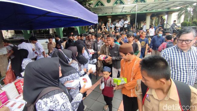 Para guru yang tergabung dalam organisasi PGRI ini membagikan makanan kepada para jemaah masjid setelah selesai salat Jumat. Makanan berupa nasi dan snack tersebut berasal dari para guru dari setiap pengurus cabang PGRI di Ciamis.