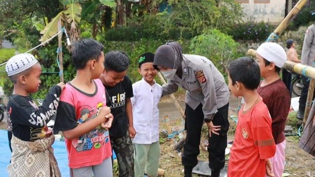 Anak-anak yang saat ini tak bersekolah karena kondisi masih darurat diiringi rentetan gempa susulan, bercengkerama dengan polwan. Tak hanya bermain, mereka juga diberikan hadiah dan makanan ringan.