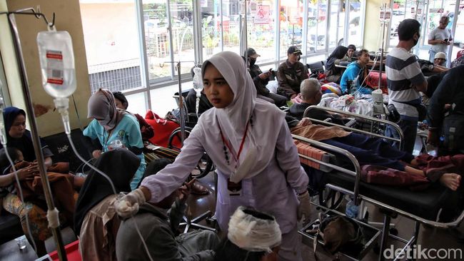 Dari data BNPB itu, total korban yang menjalani perawatan di rumah sakit rujukan itu sebanyak 699 orang. Paling banyak dirawat di RS Cimacan, yakni sebanyak 270 korban. Kemudian, RS Bhayangkara sebanyak 150 korban, RS Hasan Sadikin sebanyak 95 orang. Di RSUD Sayang sebanyak 67 korban. Selebihnya, rumah sakit merawat sebanyak lima sapa 39 pasien.