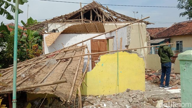 Pantauan detikJabar di lokasi kejadian, puing bangunan kantor Madrasah Diniyah Takmiliyah Awaliyah (MDTA) Bhidayatunnihayah di Desa Pranggong, Kecamatan Arahan, Kabupaten Indramayu tampak masih berserakan. Dinding bangunan roboh dihantam angin kencang.