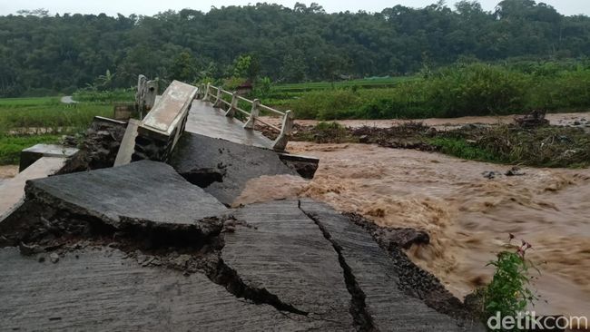 "Jadi jembatan yang menghubungkan akses jalan desa itu ambruk lantaran diterjang aliran sungai yang meluap akibat hujan deras yang terus mengguyur," ujar Maman saat dihubungi detikJabar, Jumat (16/12/2022) malam.