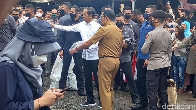 Presiden Joko Widodo (Jokowi) mendatangi Pasar Terminal, Kelurahan Sukamelang, Kabupaten Subang, Selasa (27/12/2022). Dalam kunjungannya ia memantau harga bahan kebutuhan pokok di sana.