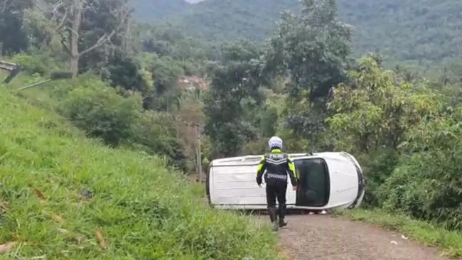 Kecelakaan lalu lintas terjadi di kawasan Gentong, Kecamatan Kadipaten Kabupaten Tasikmalaya, Jumat (40/12/2022). Sebuah mobil yang sedang melibas turunan curam di kawasan ini tergelincir ke luar badan jalan. Mobil terguling, beruntung sopir selamat.