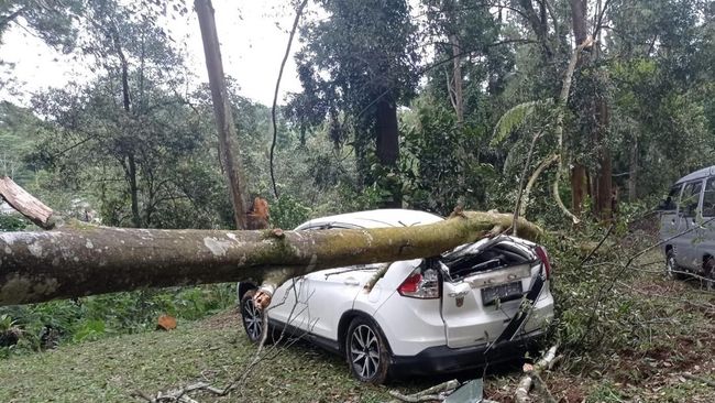 Sebuah pohon kayu manis tumbang di kawasan wisata Camping Ground Selabintana, Kabupaten Sukabumi. Pohon tersebut menimpa mobil wisatawan yang tengah parkir di lokasi wisata.