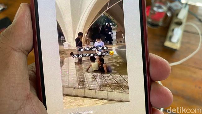 Salah satunya spot kolam yang berada di dekat tempat wudhu di area luar masjid. Kolam itu malah dijadikan tempat berenang bagi pengunjung anak-anak. Video aksi anak-anak berenang di kolam itu pun viral di media sosial.