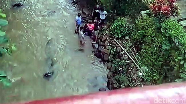 Tubuh perempuan itupun melayang dan jatuh di aliran sungai yang saat kejadian untungnya dalam keadaan surut. Warga kemudian pontang-panting berusaha menyelamatkan perempuan tersebut.