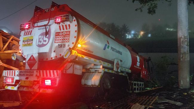 Truk tangki bahan bakar minyak (BBM) milik Pertamina kecelakaan di Jalan Letjen Mashudi, Kelurahan Setiaratu, Kecamatan Cibeureum, Kota Tasikmalaya, Jumat (6/1/2023) sekitar pukul 03.30 WIB.