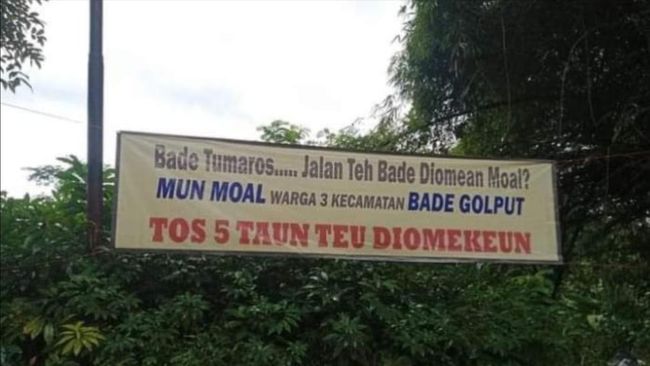 "Bade Tumaros..... Jalan Teh Bade Diomean Moal? MUN MOAL WARGA 3 KECAMATAN BADE GOLPUT. TOS 5 TAUN TEU DIOMEKEUN (Mau bertanya, jalan mau dibetulkan tidak? Kalau tidak warga 3 kecamatan mau Golput. Sudah 5 tahun tidak dibetulkan)," demikian isi tulisan dalam foto spanduk yang tersebar itu, Kamis (19/1/2023).
