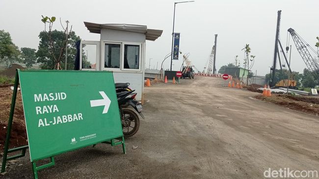 Setelah melintasi di kawasan yang masih dalam progres pembangunan itu, pengendara bakal menemukan penanda arah untuk menuju Masjid Raya Al Jabbar. Lokasi penanda ini berada persis di pos satpam. Pengendara bakal diarahkan ke jalan sempit, normalnya bisa dilintasi satu mobil. Jalan ini persis di samping sungai.