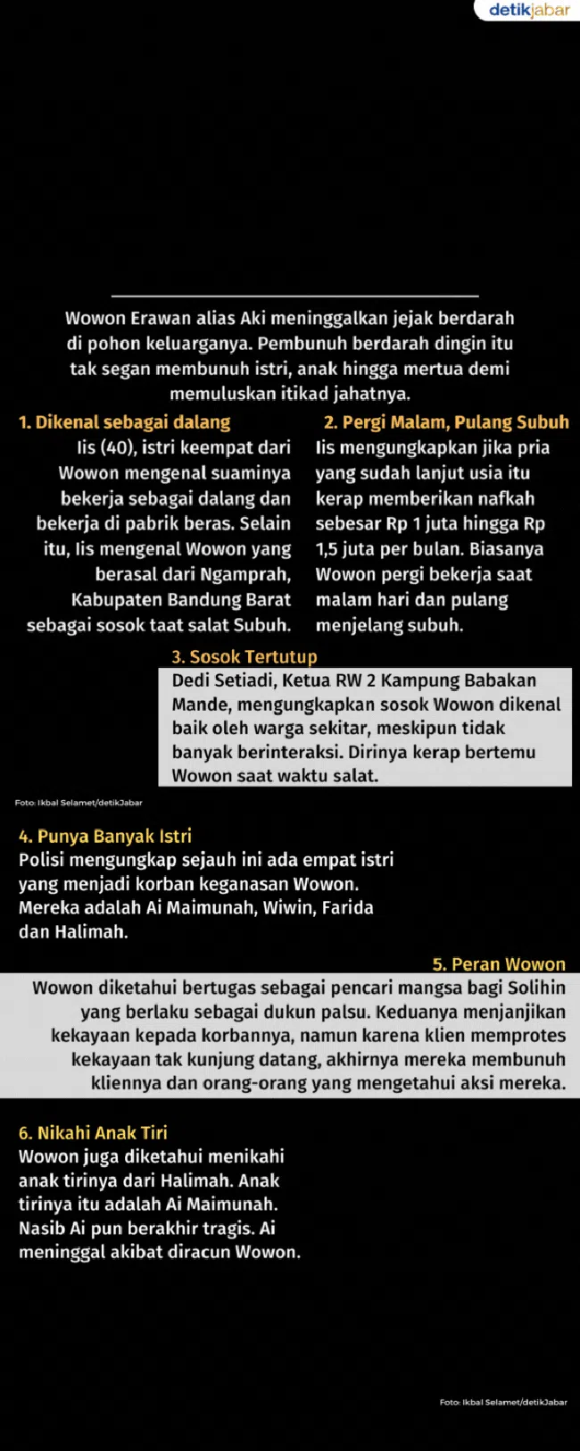 Bandung - Aksi keji dilakukan Wowon Erawan alias Aki. Pembunuh berdarah dingin itu tak segan membunuh istri, anak, hingga mertua demi memuluskan niat jahatnya. Berikut ini sederet faktanya.