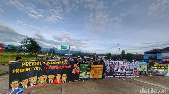 Pantauan detikJabar, massa aksi membentangkan berbagai macam atribut. Mereka tak henti-hentinya menyuarakan penolakan terhadap aktivitas yang dilakukan oleh Anies Baswedan tersebut.