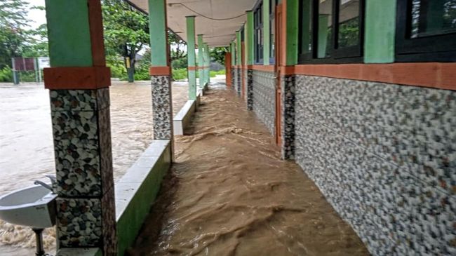 "Banjir mengganggu aktivitas belajar mengajar untuk keselamatan anak sekolah, berjumlah 66 siswa dari kelas 1 sampai 6. Kepala sekolah memutuskan untuk memulangkan anak didiknya untuk belajar di rumah karena arus banjir cukup deras membahayakan dan kondisi hujan masih terus mengguyur lokasi," sambung Daeng.