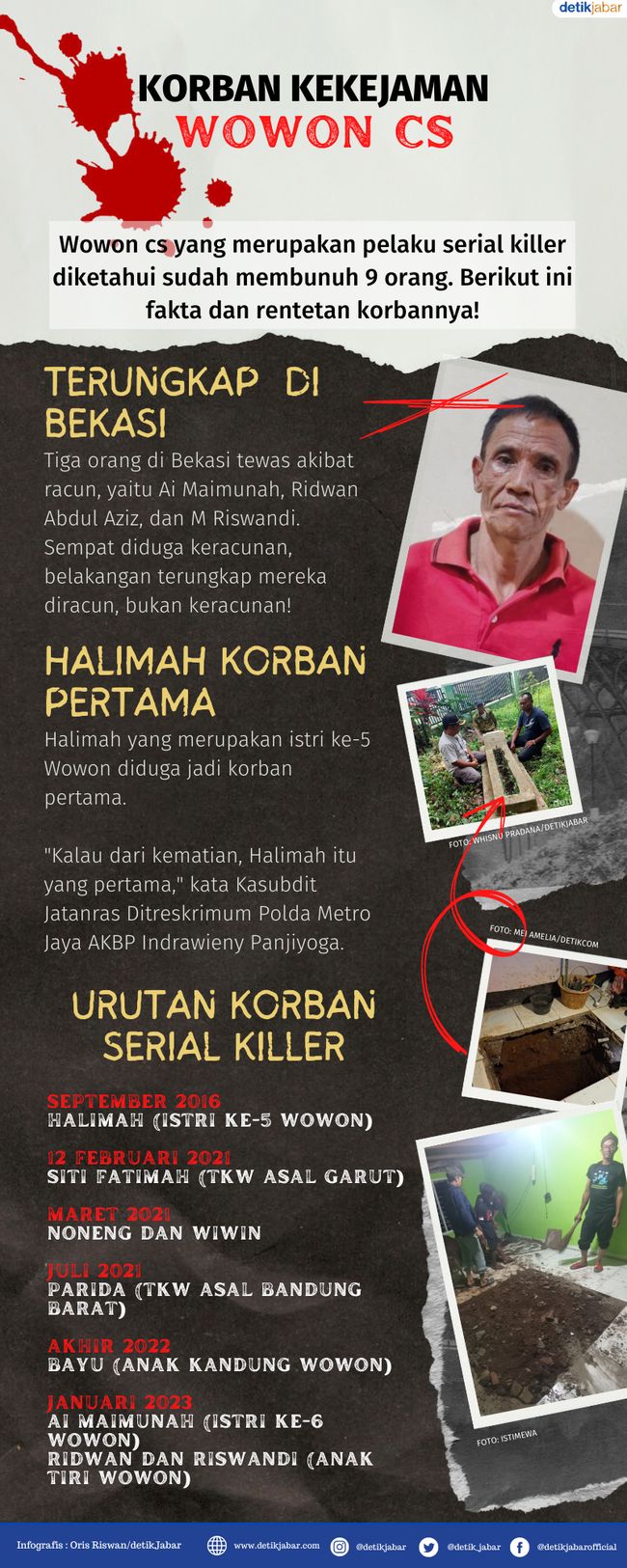 Bandung - Wowon cs, pelaku serial killer, diketahui sudah membunuh sembilan orang. Sebagian di antaranya bahkan ada istri dan anak kandung Wowon. Berikut ini daftar korban Wowon cs.