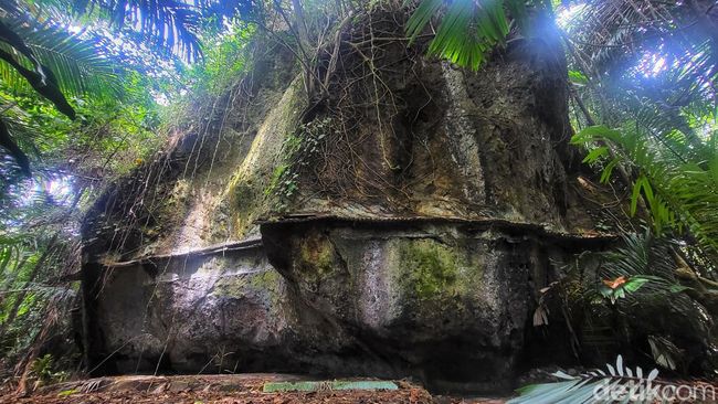 Suasana tempat itu mirip di film-film bertemakan perburuan harta karun, mirip tempat disembunyikannya harta karun ala-ala Indiana Jones. Akar yang menggantung dari pohon besar dan serakan dedaunan di undakan tangga menuju ke batu raksasa.