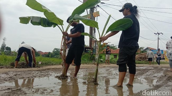 Warga Kecamatan Arahan, Indramayu menanam pohon pisang di tengah jalan yang rusak. Aksi protes itu dilakukan karena jalan rusak sering menimbulkan korban berjatuhan.