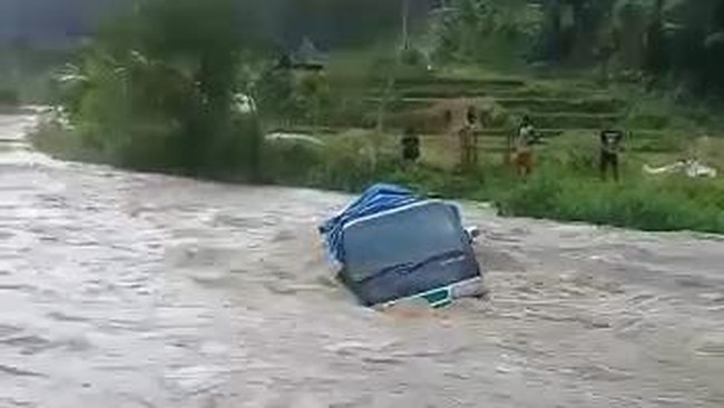 Sebuah mobil pikap nyaris terseret air bah di Desa Sukamulya, Kecamatan Naringgul, Kabupaten Cianjur, Sabtu (18/2/2023) petang. Beruntung mobil dan pengemudi bisa diselamatkan warga sekitar.