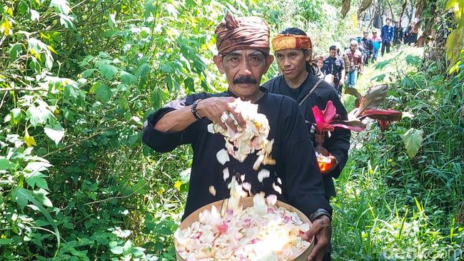 Tanpa beralas kaki, ia nyaman menginjak panasnya permukaan jalan dan tajamnya benda-benda berserakan di tanah dan rerumputan. Di belakangnya berbaris orang-orang membawa ragam sesajian atau sajen yang akan dipersembahkan.