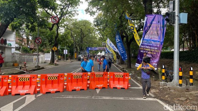 Pantauan detikJabar, Minggu (5/3/2023) water barrier dipasang di jalan tersebut. Sejumlah panitia berpakaian biru, mengarahkan pengendara yang hendak melintas di jalan tersebut agar mencari jalur lainnya.