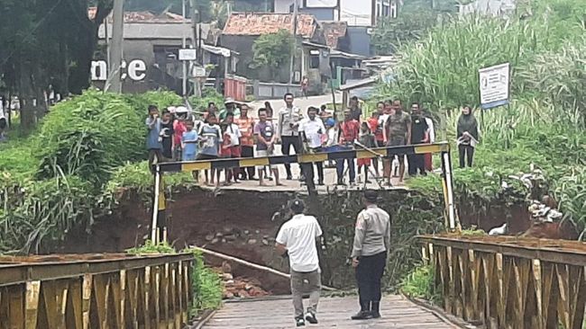 "Dikarenakan terjadinya pergerakan tanah dan debit air yang cukup banyak sehingga mengikis bibir sungai menyebabkan Jembatan Ciherang penghubung dua kecamatan amblas," ujar Budi kepada awak media, Selasa (07/03/2023).