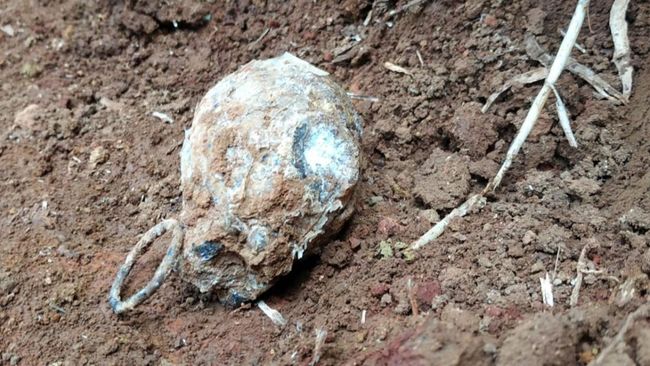 Warga Dusun Cikadung, Desa Jalatrang, Kecamatan Cipaku, Kabupaten Ciamis, Jawa Barat, menemukan sebuah granat nanas saat menggali tanah, Minggu (13/3/2023). Diduga granat nanas itu peninggalan gerombolan DI/TII.