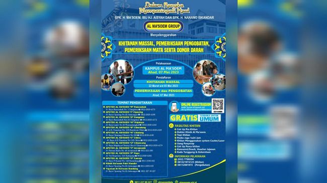 Informasi ini dibagikan akun Instagram resmi Universitas Al-Masoem yakni @masoem_university, Minggu (26/3/2023). Khitanan massal ini gratis dan terbuka untuk umum.