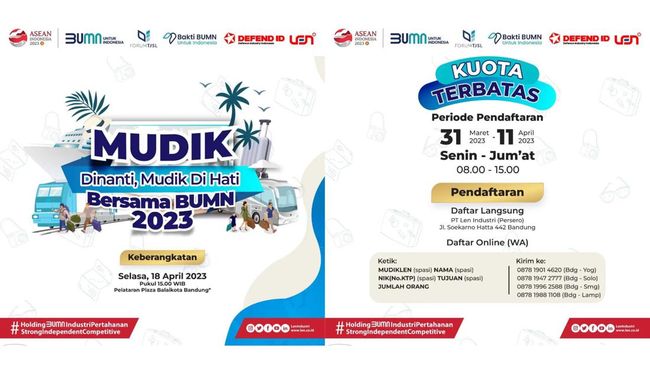 Dikutip detikJabar, Minggu (2/4/2023) di Instagram resmi PT LEN @lenindustri, kuota mudik gratis ini terbatas dengan periode pendaftaran dibuka dari Tanggal 31 Maret - 11 April 2022 setiap Senin-Jumat dari Pukul 08.00-15.00 WIB.