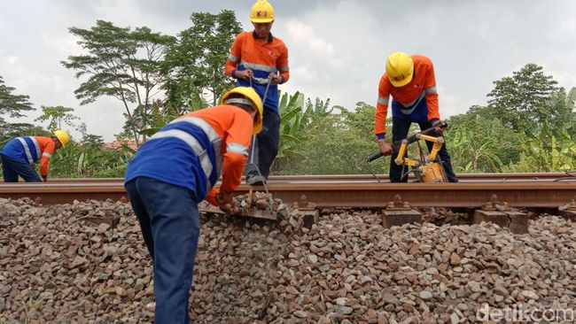 Pantauan detikJabar, di sekitar perlintasan stasiun Jatibarang, Kabupaten Indramayu, sejumlah petugas tampak memperbaiki jalur kereta. Petugas mengganti sejumlah bantalan rel yang lapuk serta dilakukan peninggian rel.